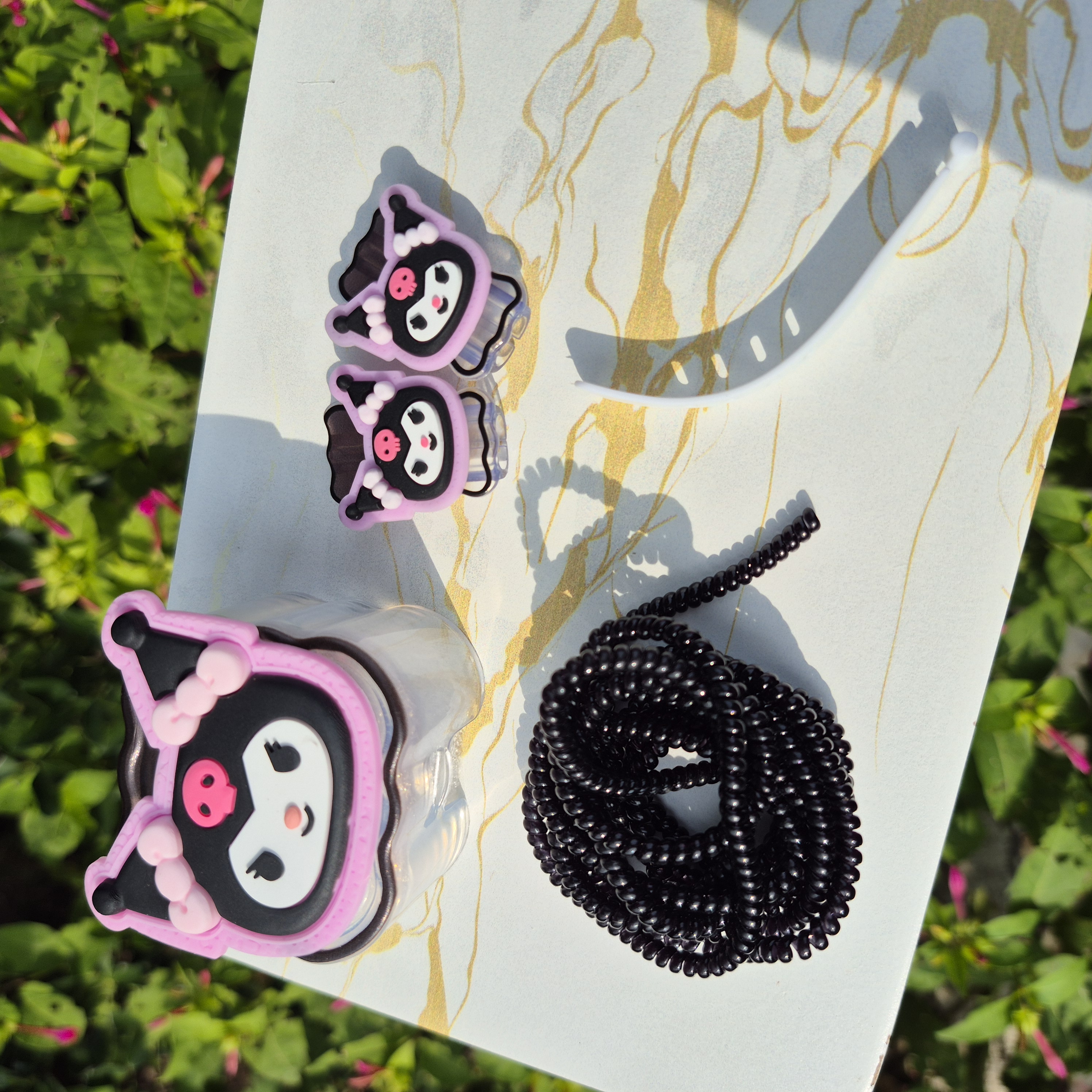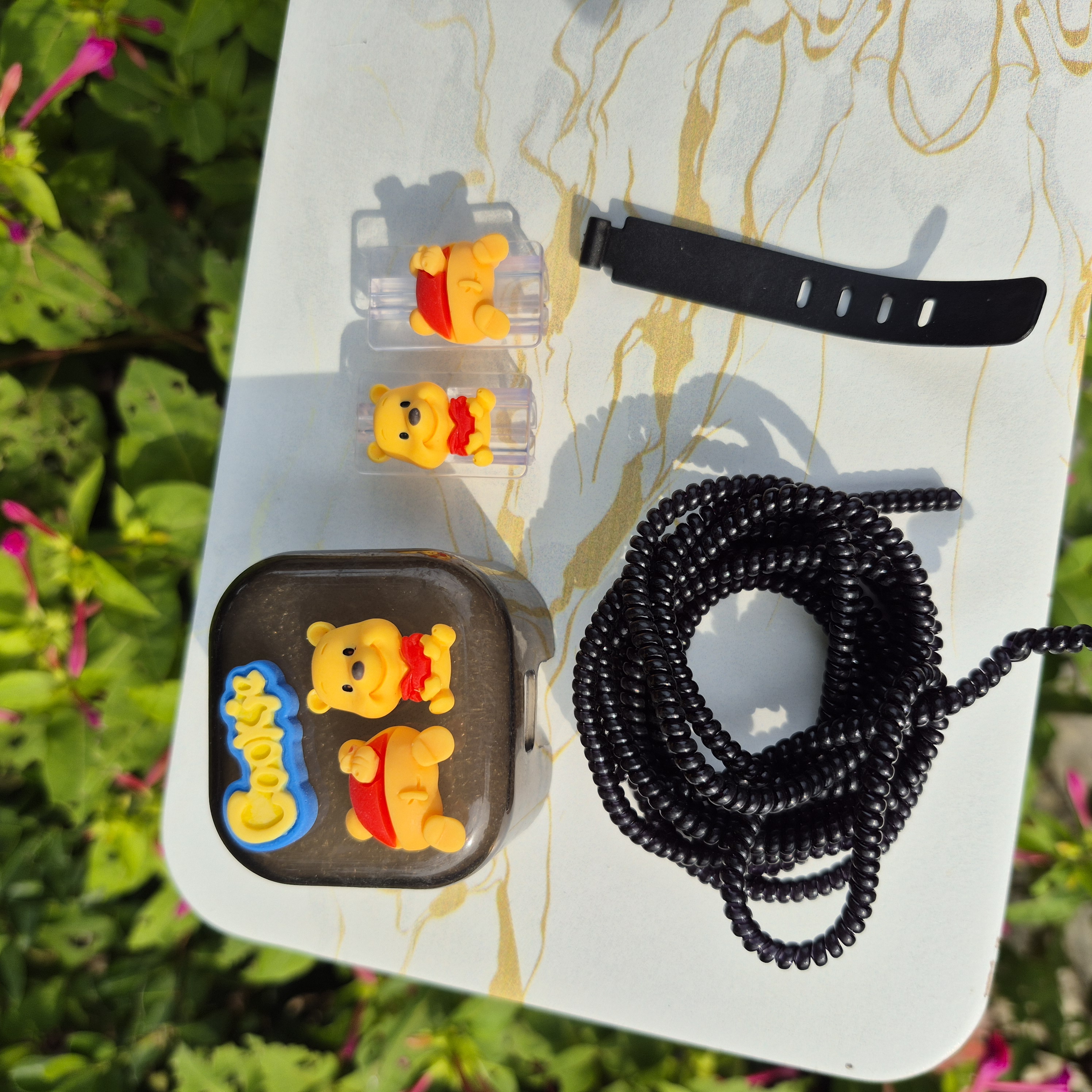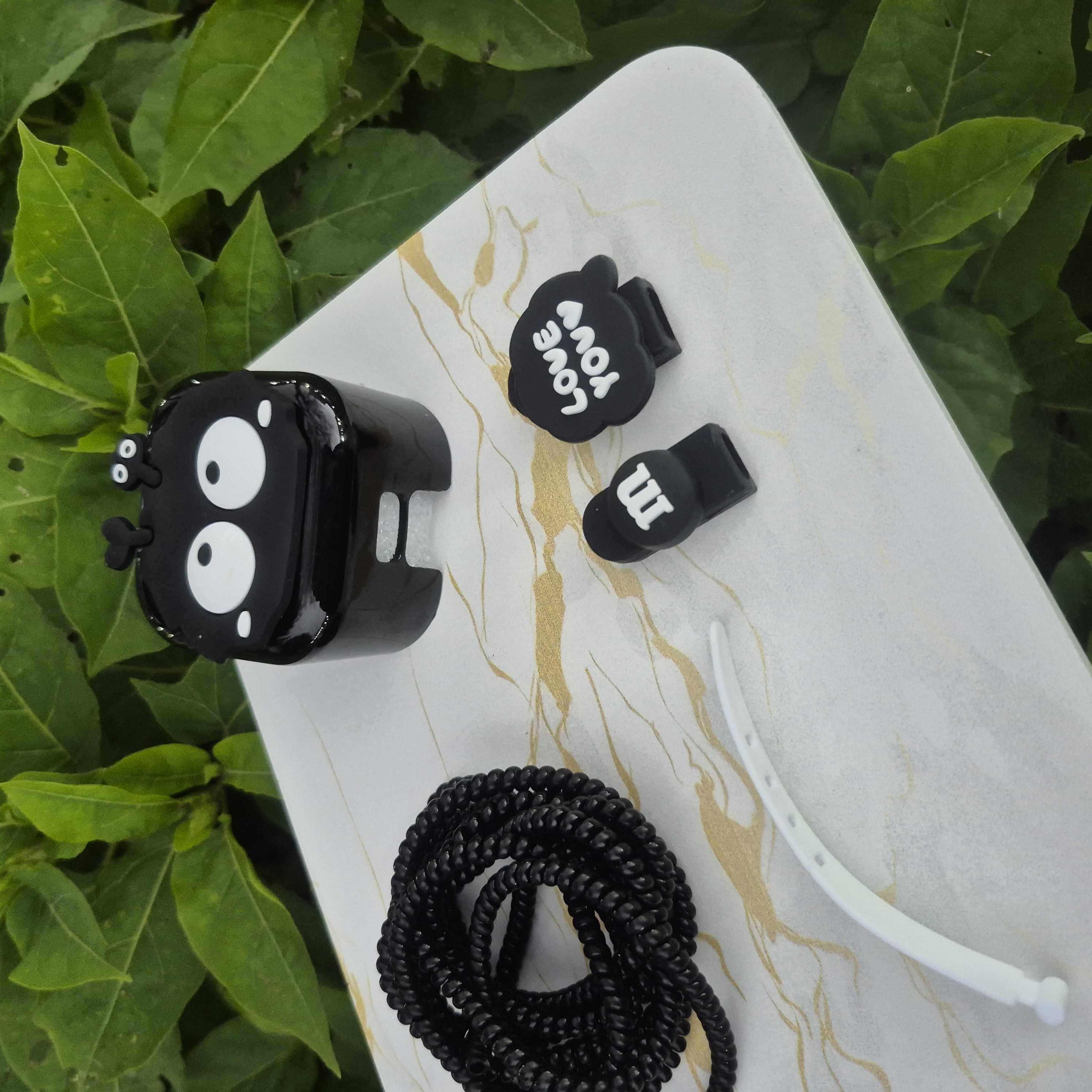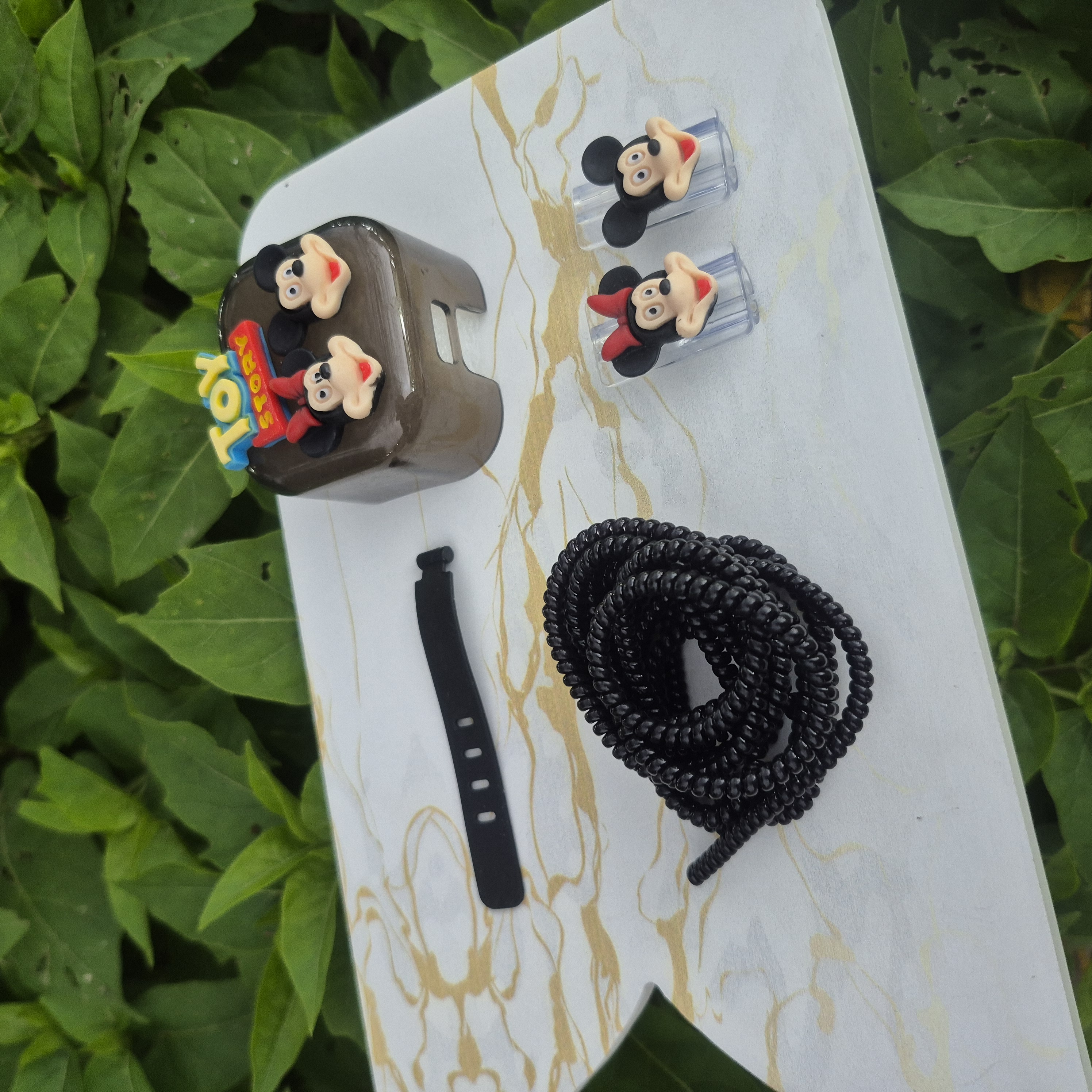 1 عدد محافظ آداپتورعروسکی+ 1 عدد محافظ کابل رنگی+1 عدد کابل جمع کن+2 عدد سر محافظ کابل عروسکی